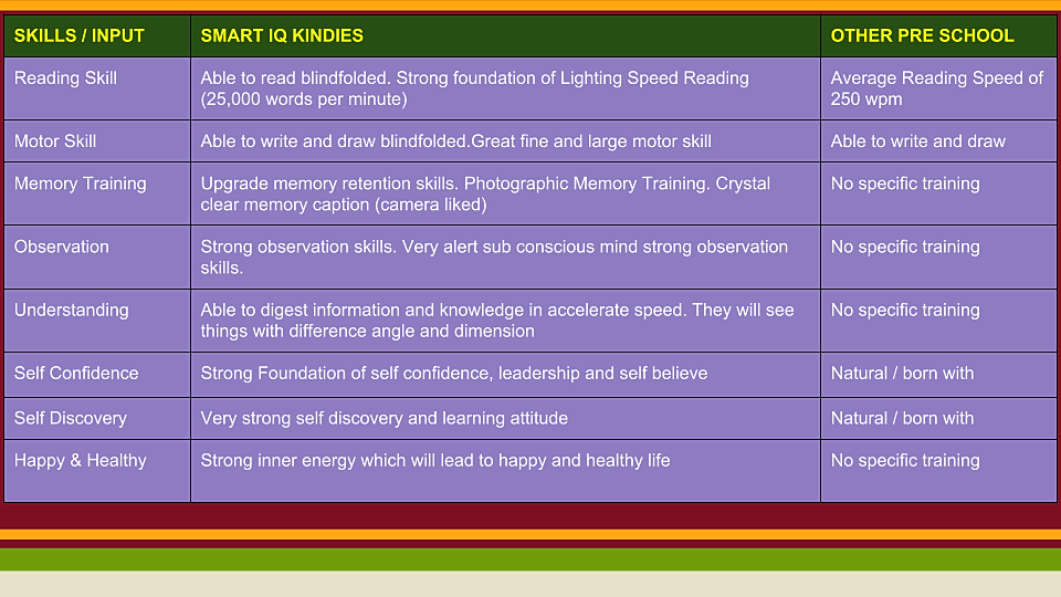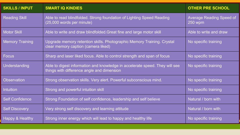 The golden age of 0-6 years old is a very crucial period to have a strong foundation so that the child will grow as an extra ordinary people in their life. Some parents only focusing on reading skills which should be master at early age whereby the brain training by right should come together. Due to lack of understanding on facts, they will missed this golden opportunity to train their children's brain during the development growth period and the true hidden brain potential will remain unlocked.